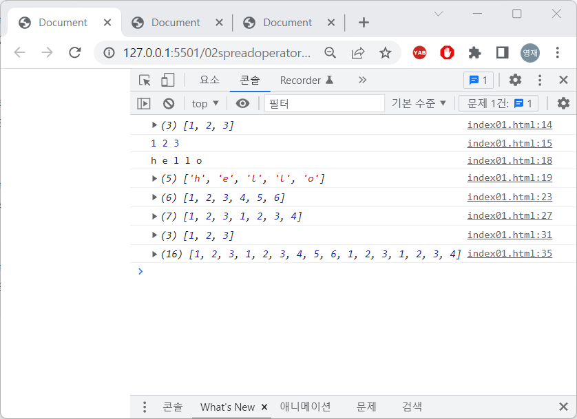 console.log(...arr); //배열 요소의 나열. 전개구문